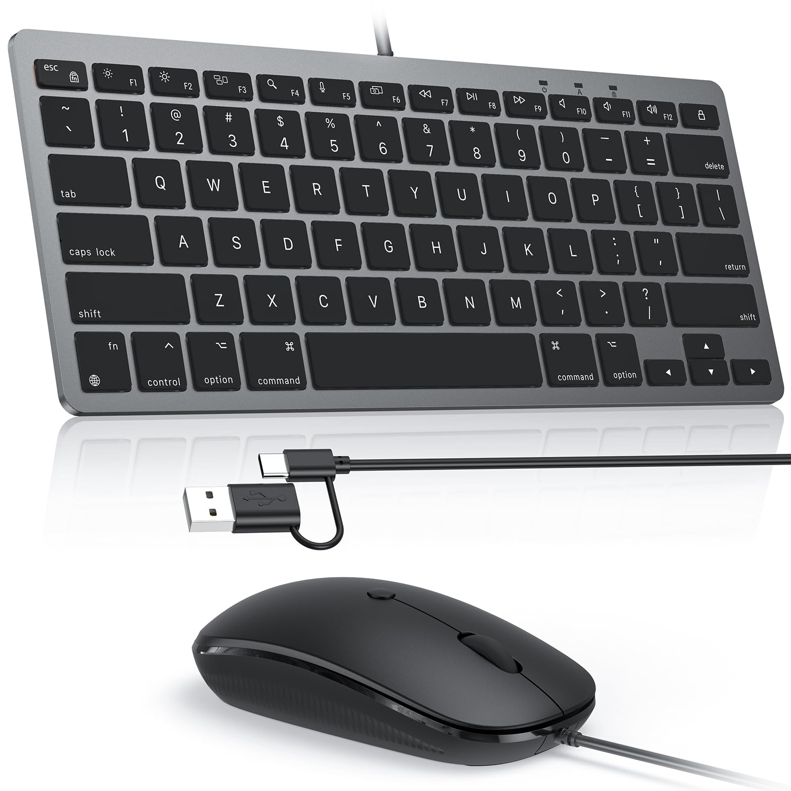 Teclado y ratón con cable OMOTON compatibles con Mac, teclado con interfaz dual (Tipo C y USB A), ratón con interfaz USB A para MacBook Pro/Air, iMac, Mac, color negro y gris.
